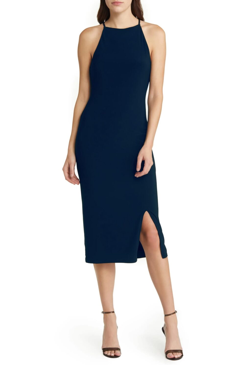 A shapely halter dress designed with slinky crossback straps and a leg-baring slit is an elegant option for your upcoming event.
